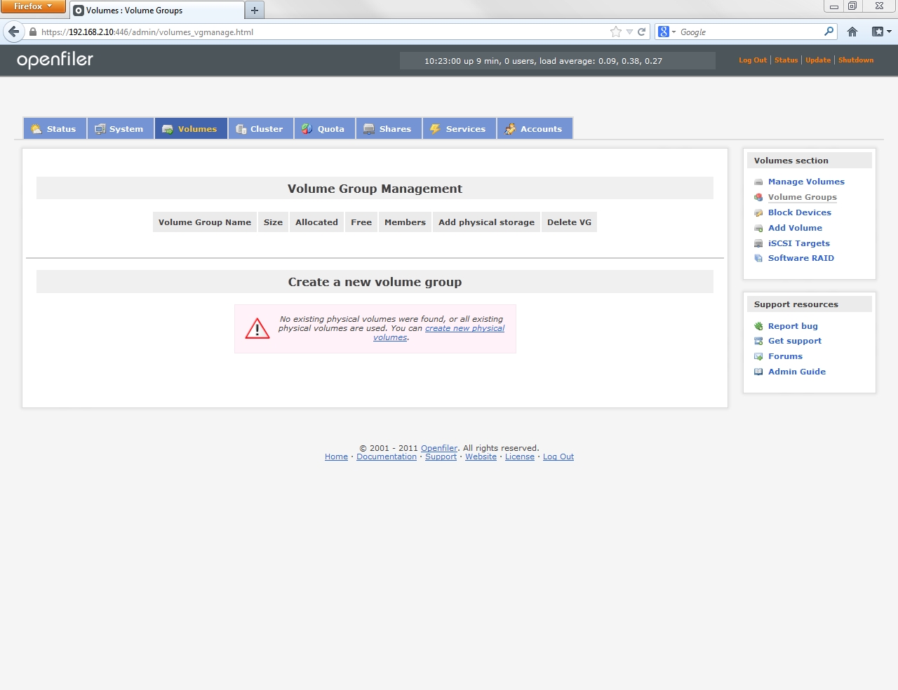 The management of the storage presented by Openfiler is handled under the Volumes tab. Access Volumes at this point displays the page above, as no configuration has been completed.