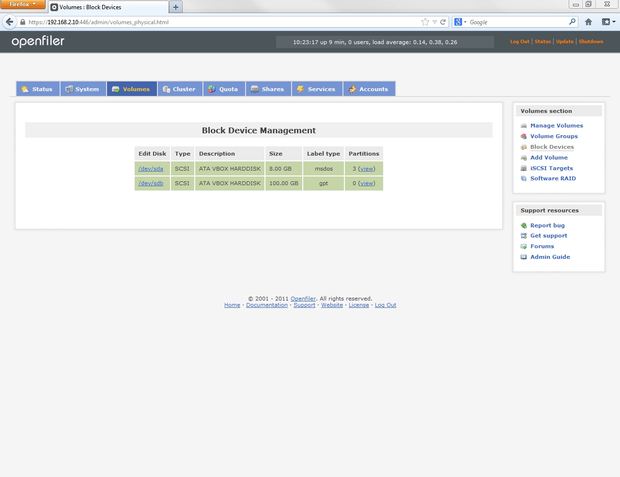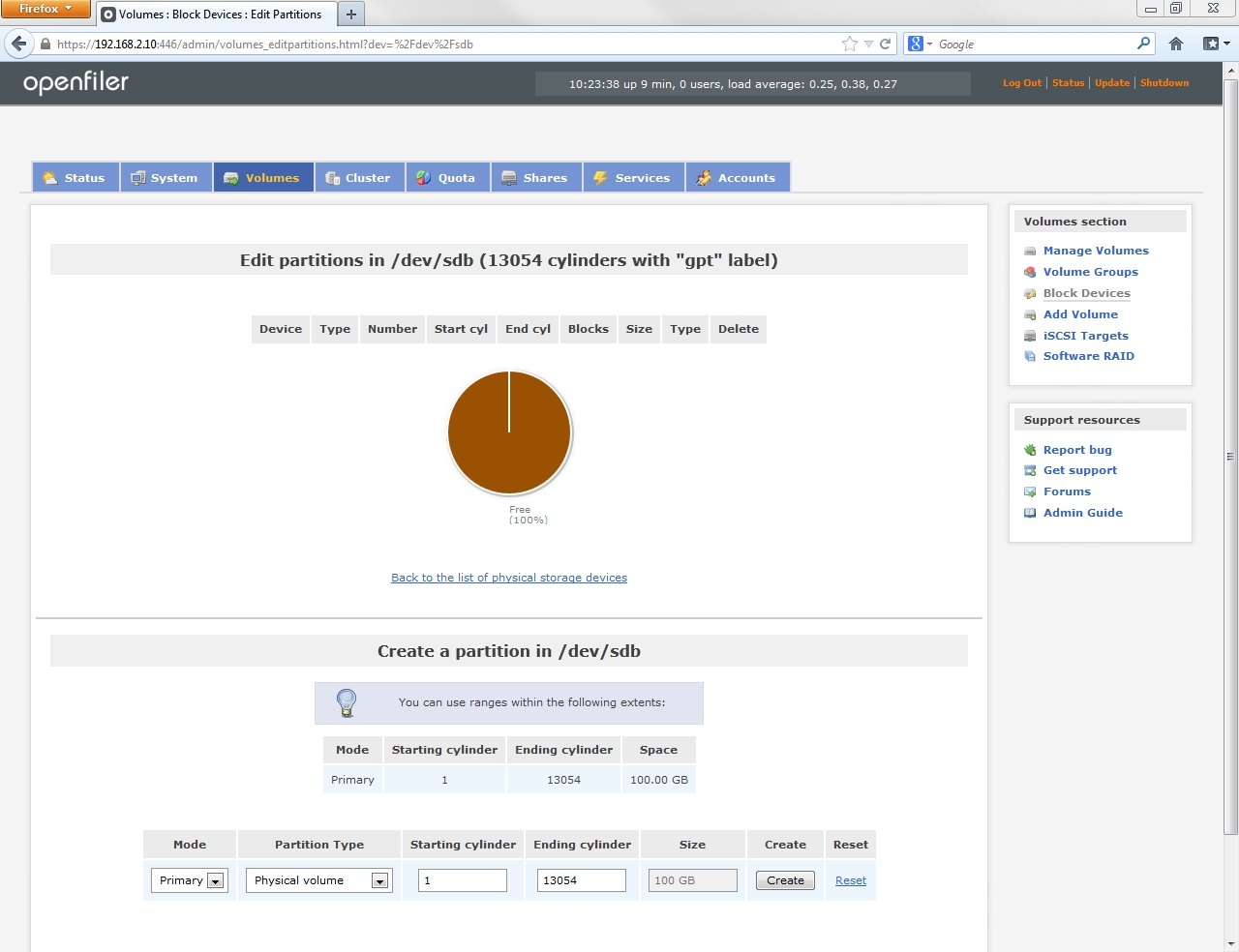 The Block Device Management page lists the physical drives available to Openfiler. In my configuration the /dev/sda drive is the 8GB virtual drive where Openfiler is installed. /dev/sdb is the new, empty 100GB drive allocated for shared storage.
