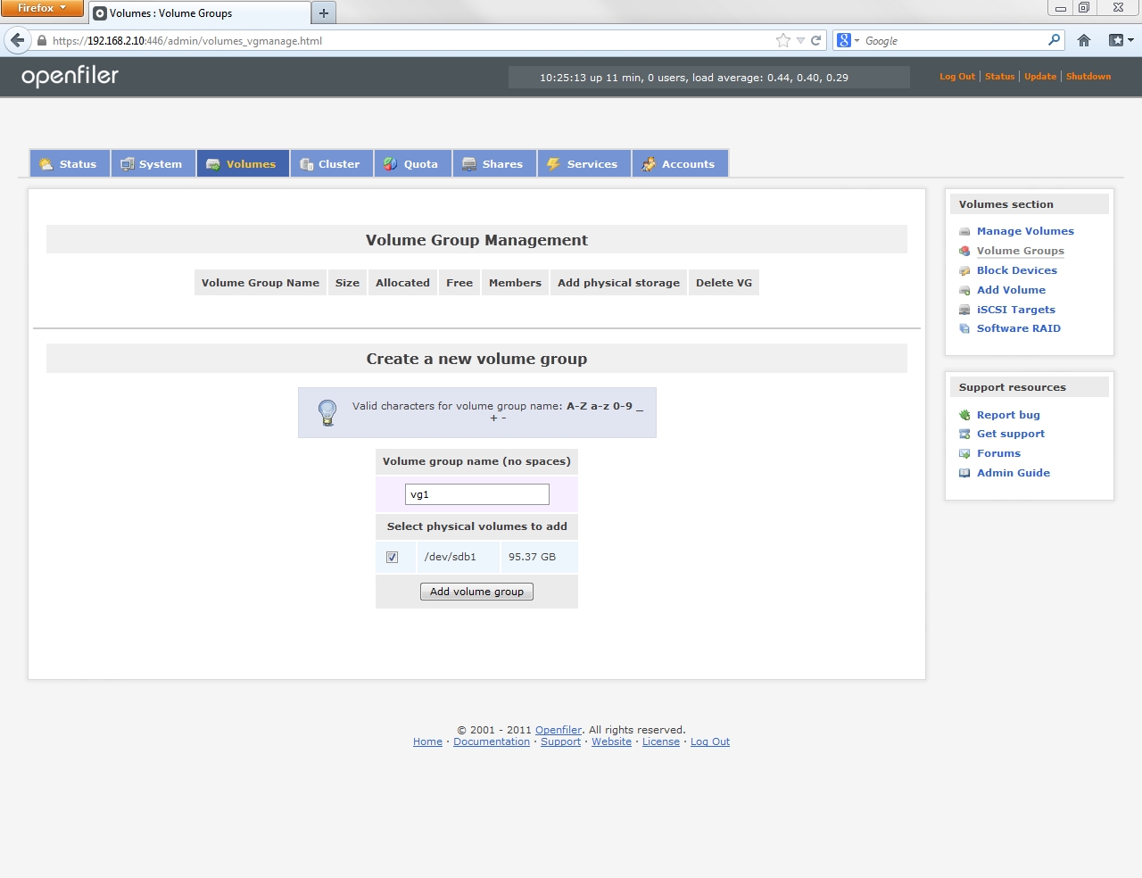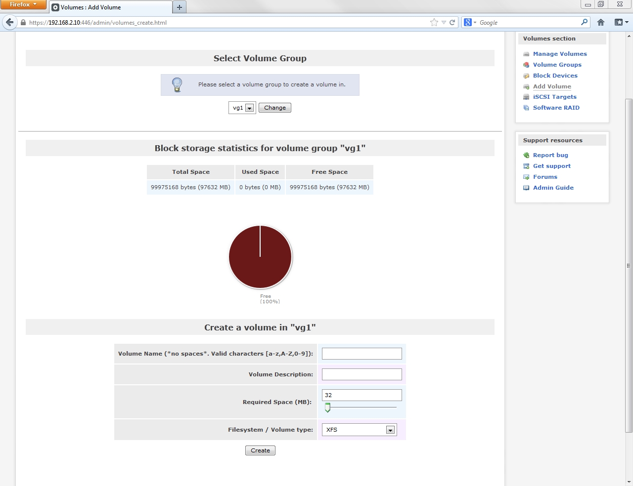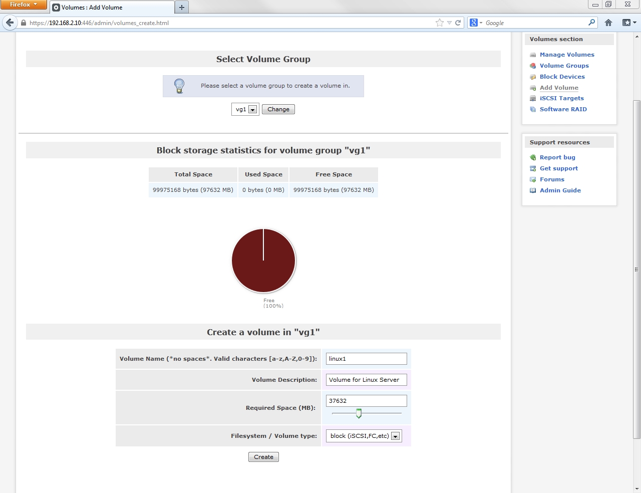 Unlike on the previous visit to this page the create new volume group section now contains the elements needed to configure a volume group.
