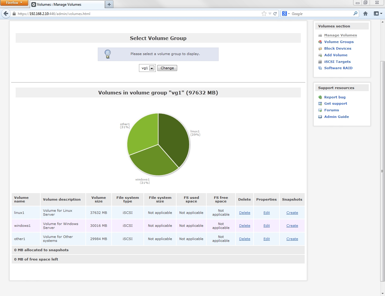 The Manage Volumes page allows you to review and edit the settings of each of the volumes configured within a volume group.