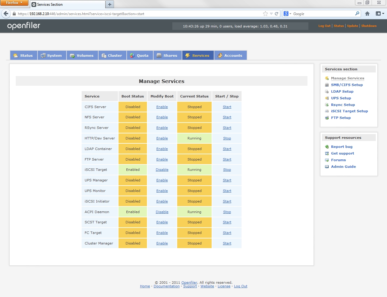 Openfiler supports a variety of technologies and the services that provides the functionality of the system are controlled from the services page. In order to facilitate iSCSI enable and start the iSCSI Target service.