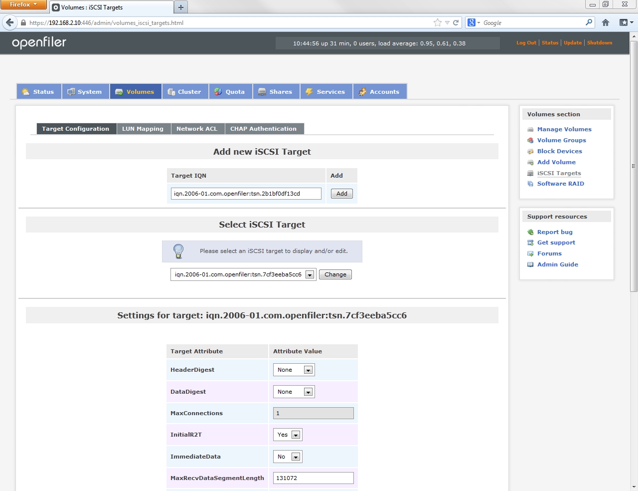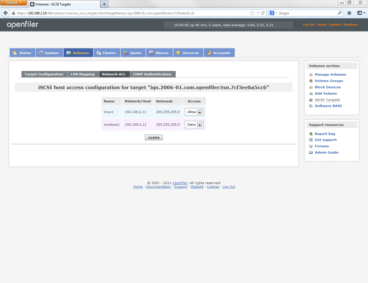 Configuring Openfiler storage and iSCSI targets