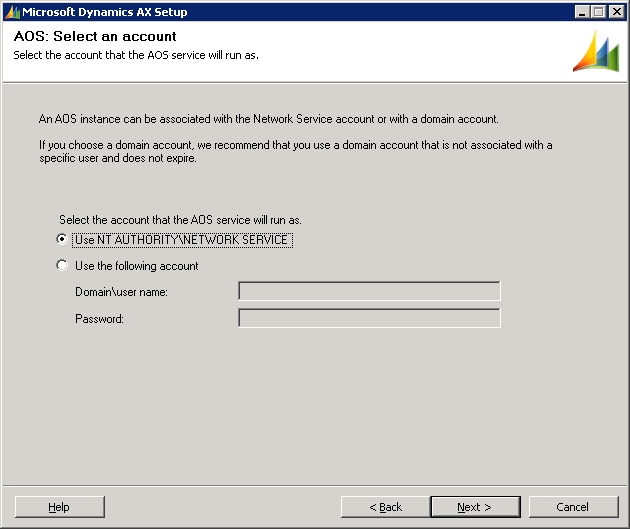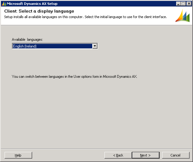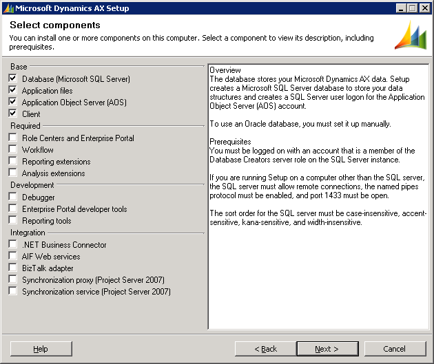 The four base components of Database (Microsoft SQL Server), Application Files, Application Object Server (AOS), and Client are required for single application server type installations. Note that selecting “Database” does not install SQL Server – the RDBMS needs to be installed in advance of installing Dynamics AX. The Database option is used to create a database in an instance of SQL Server.