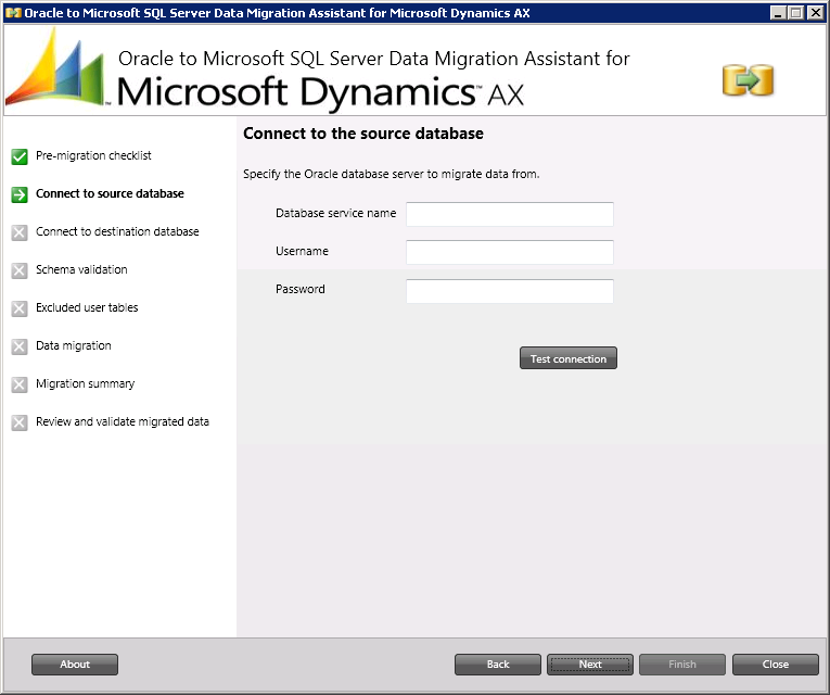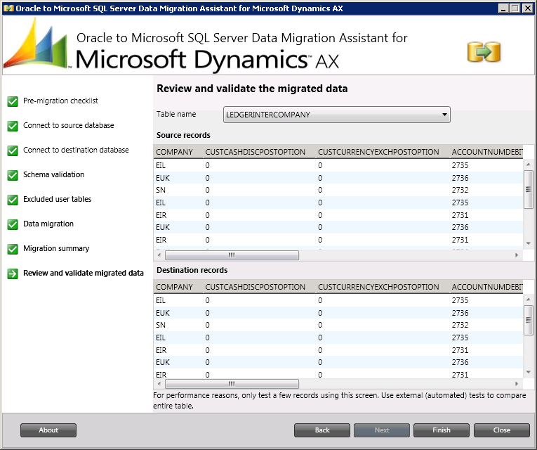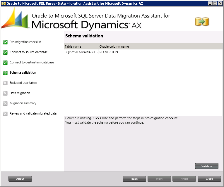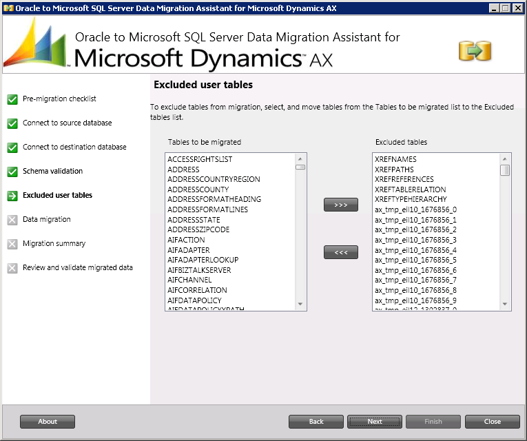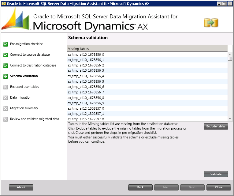 A list of missing tables will be produced. This is expected behaviour and addresses tables that are not to be migrated, for example Oracle temporary tables and tables relating to disused or unlicensed AX modules.